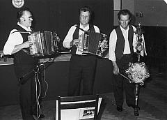 Začátky Heligonky. Vystoupení bez zpěvu, konference 1982, Společenský dům. Zleva: J. Malina, L. Cáb, C. Stavinoha.