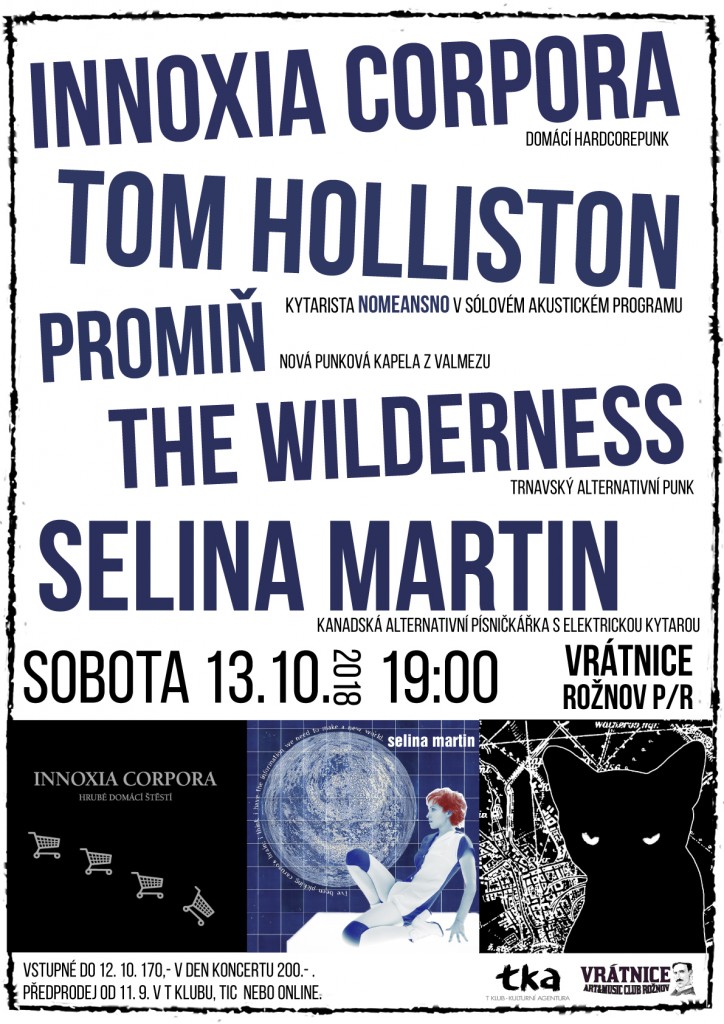 Tom Holliston, kytarista kanadských NOMEANSNO začal svou sólovou dráhu v roce 2002 a po definitivním rozpadu kapely bratří Wrightů pokračuje ve své misi. Hraje originální dynamické písničky, ve kterých se doprovází na akustickou kytaru,. Na své evropské turné vyráží společně s další Kanaďankou, usídlenou dočasně v Cannes, Selinou Martin, která dokáže uhranout diváky na první poslech. Příjemný zpěv podpořený dravou elektrickou kytarou evokuje u recenzentů přirovnání k PJ Harvey, Björk, a ano, Davidu Byrneovi! Trnavští The Wilderness kvůli nemoci nevystoupí. Domácí scénu budou reprezentovat Innoxia Corpora, kteří mají na kontě čestvý desetipalec a jejich kolegové ze zkušebny vedle, úplně nová kapela z Valmezu Promiň.
