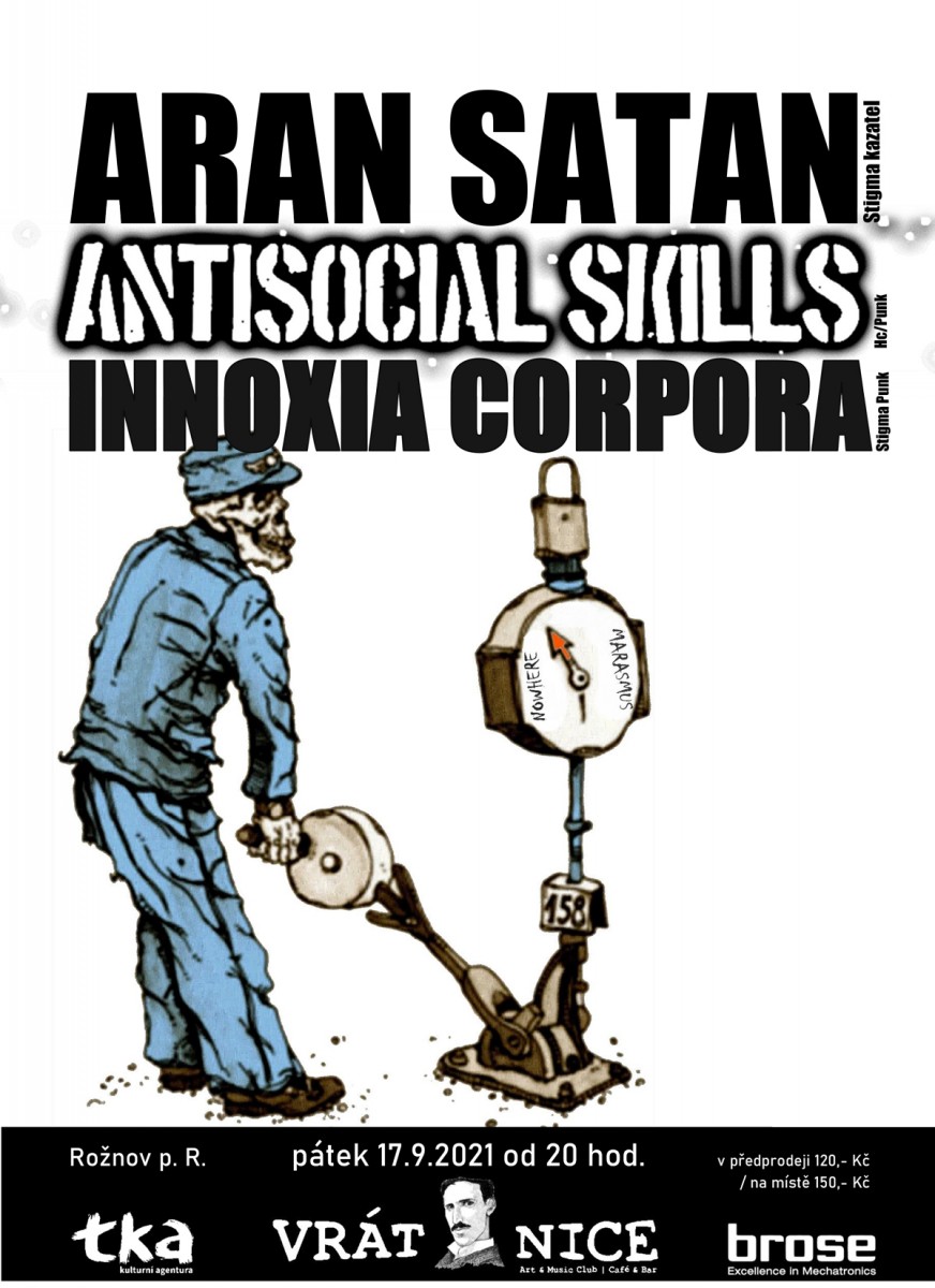 Takto vydavatelství Silver Rocket annoncovalo vydání společné desky Innoxia Corpora / Aran Satan "Stigma". Spojení, které se právě ve Vrátnici aktivovalo zpečetíme společným koncertem. A přidáme ještě jednu hardcore lahůdku - v Praze usazenou slovenskou formaci Antisocial Skills.