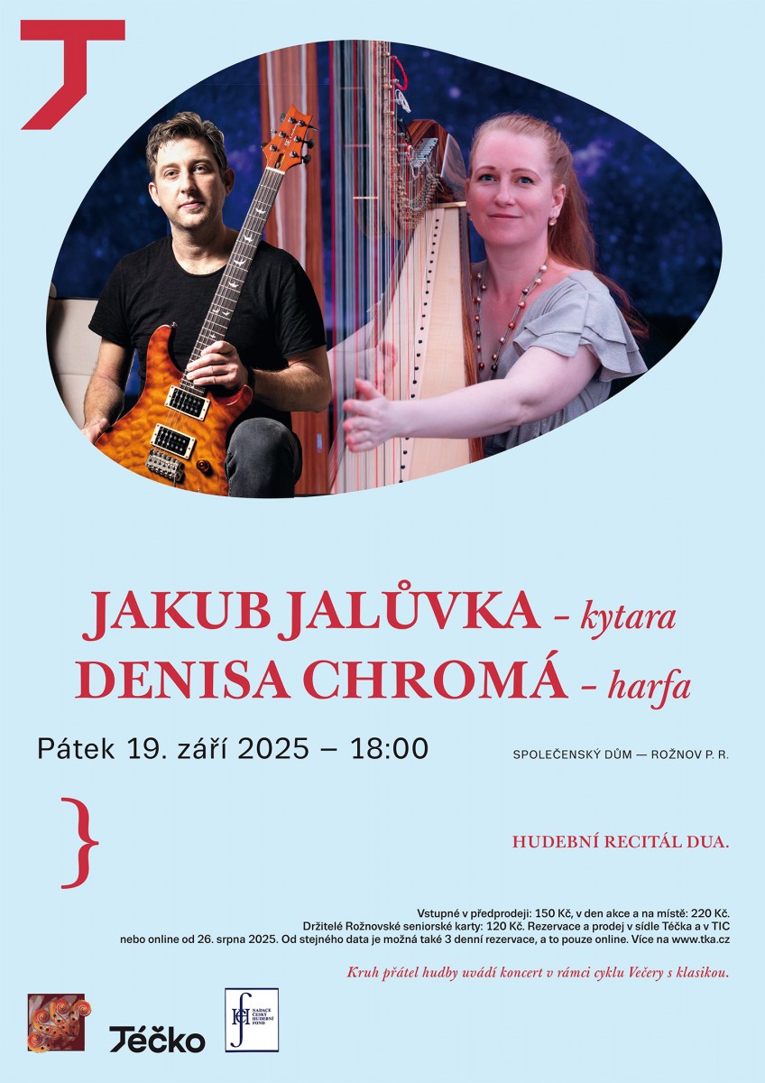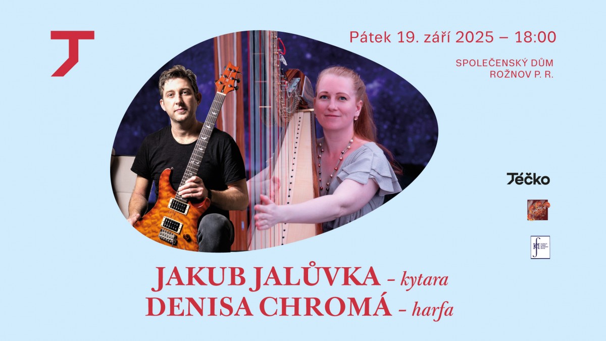 Jakub Jalůvka, virtuóz na kytaru a Denisa Chromá, talentovaná harfistka, představí program, který překračuje žánrové hranice. V jejich interpretaci zazní díla napříč klasickými hudebními epochami, od renesance a baroka po romantismus, doplněná o mistrně adaptované populární skladby. Toto spojení kytary a harfy slibuje nevšední zvukovou paletu a hluboký umělecký zážitek.